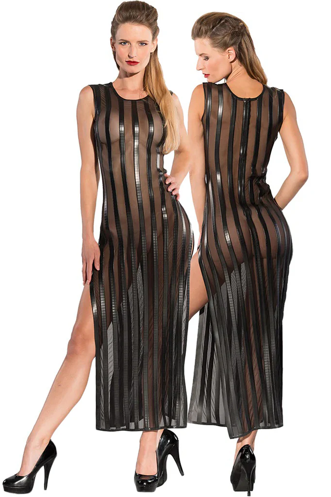 Fræk og let gennemsigtig lang kjole i stribet Datex og net. Lukkes med lynlås bagpå.